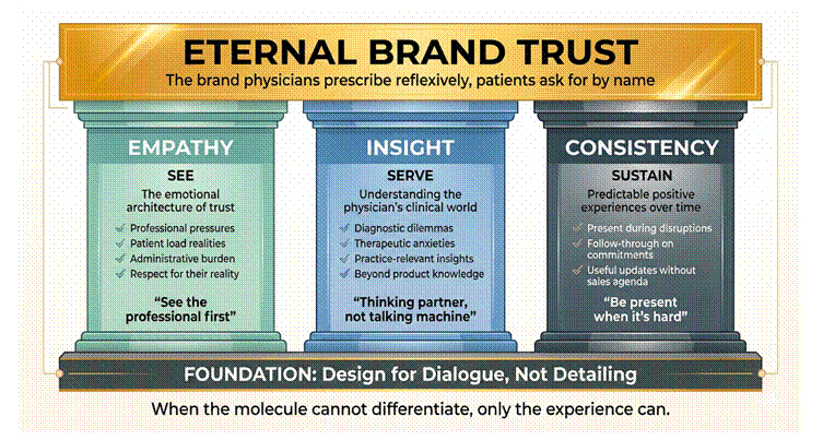 In my work as a Customer Experience designer, I have observed that eternal brands—the ones physicians prescribe reflexively, the ones patients ask for by name—are built on three pillars: Empathy, Insight, and Consistency. See, Serve, Sustain.